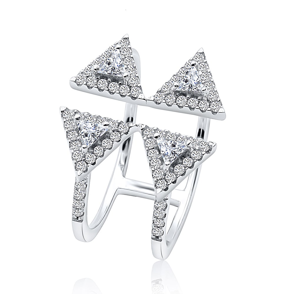 This women's cuff diamond ring is made up of two bands that are interlinked to form an attractive and dynamic design. A halo of small round cut diamonds surrounds the triangle shaped diamond, enhancing its brilliance and adding a touch of glamour. The interlinking of the bands adds a unique and modern touch to the design, making it truly eye catching jewellery. All Temple and Grace jewellery is beautifully crafted to the highest standards and is made at our jewellery workshop directly by us (skilled jewellery craftsmen). This is why you can save over 40% when compared to high-street retail prices. We also offer a lifetime warranty and unmatched 100 day returns. You can shop online or book an appointment to visit our jewellery boutiques in Sydney, Melbourne, Brisbane, Perth and Adelaide.
