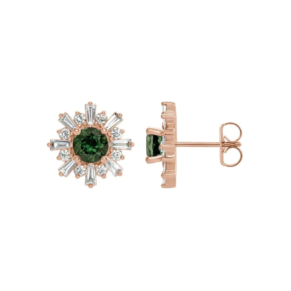 These women's studs feature a stunning green tourmaline stone in the centre, set in a secure and sturdy four prong setting. The focal stone is surrounded by a halo of baguette cut and round brilliant diamonds, which add an extra layer of sparkle and enhance the overall beauty. They are the perfect accessory to add a touch of glamour to any outfit, and are versatile enough to be worn for any occasion. All Temple and Grace jewellery is beautifully crafted to the highest standards and is made at our jewellery workshop directly by us (skilled jewellery craftsmen). This is why you can save over 40% when compared to high-street retail prices. We also offer a lifetime warranty and unmatched 100 day returns. You can shop online or book an appointment to visit our jewellery boutiques in Sydney, Melbourne, Brisbane, Perth and Adelaide.