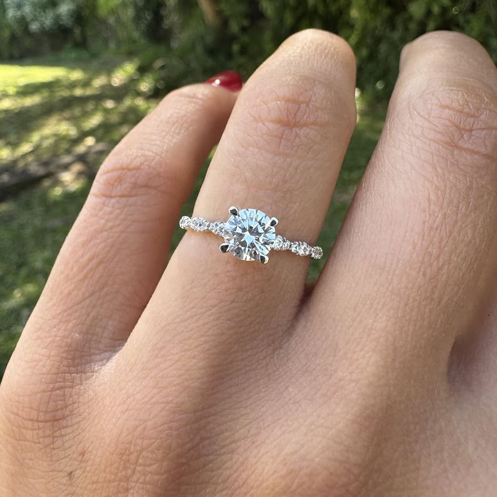 This women's engagement ring features a brilliant, natural round diamond that serves as the focal point. Surrounding the centre stone is a hidden halo of smaller diamonds that adds depth and dimension to the design, making the centre stone appear even larger and more impressive. It's shoulders are accented with diamonds in a beautiful pattern, adding even more grace and sparkle to it. All Temple and Grace jewellery is beautifully crafted to the highest standards and is made at our jewellery workshop directly by us (skilled jewellery craftsmen). This is why you can save over 40% when compared to high-street retail prices. We also offer a lifetime warranty and unmatched 100 day returns. You can shop online or book an appointment to visit our jewellery boutiques in Sydney, Melbourne, Brisbane and Perth.